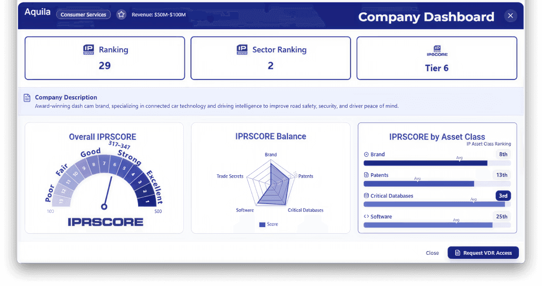 The IPRSCORE™ (i) provides Companies with a clear, compelling benchmark and narrative around their IP assets, and (ii) acts as a trusted signal that cuts through the noise for Lenders & Investors.