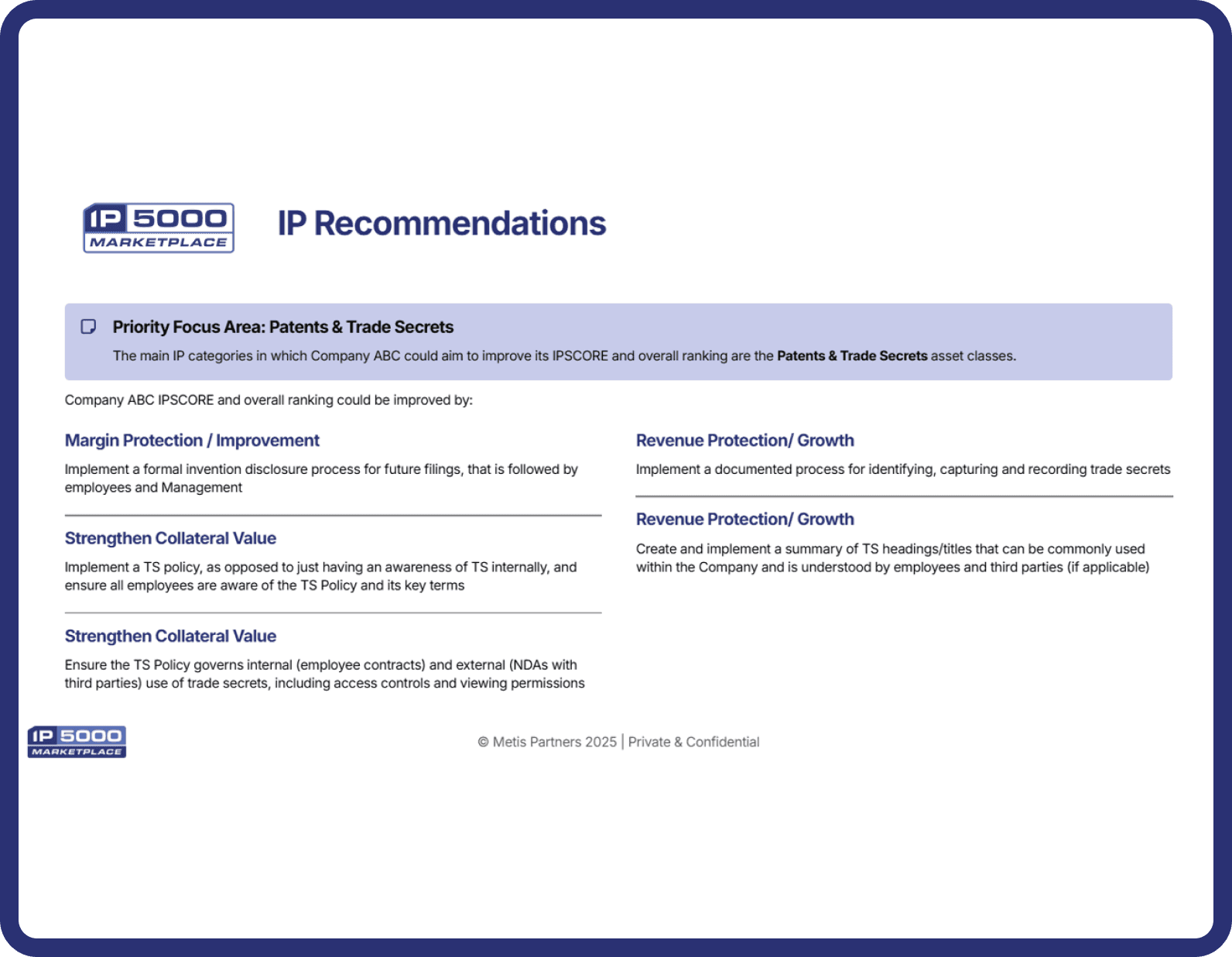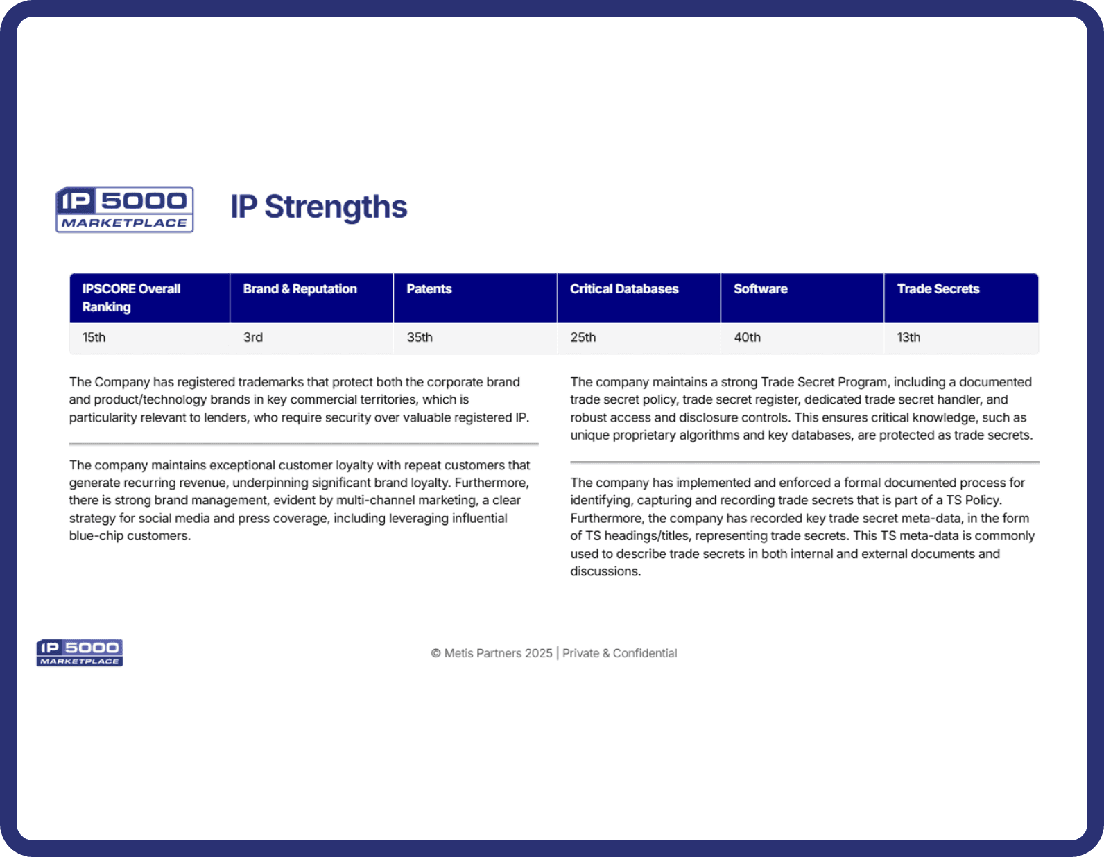 Provides companies with a clear, compelling narrative around their IP assets - identified IP Strengths that are being incorporated into CIMs & Investor Decks